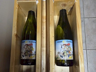 Weinflaschen vom Mosel-Camino machen sich auch gut in einem Vogelfuttersilo. |