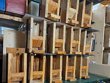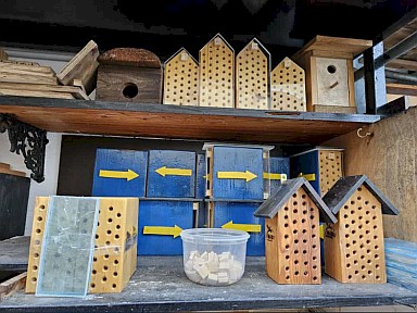| Hier wartet wieder einiges an Baumaterial auf die Abholung. Familie Franz aus Starkenburg am Mosel-Camino kümmert sich nicht nur um Pilger, sondern auch um die Natur. | Aus der Werkstatt von Dieter Eppelsheimer kommen diese 14 neuen Vogelfutter-Silos. Trotz seines Handicaps arbeit er mehrere Stunden am Tag für den Erhalt der Artenvielfalt. | Am 09.03.2024 veranstaltet der Verein Grün(h)ecken eine Bauaktion von Nistkästen. Ein Klick auf die Grafik vergrößert das Plakat mit weiteren Informationen. | ||
