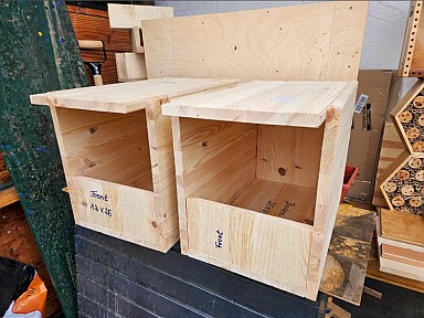 | Ein weiteres Insektenhotel befindet sich im Bau und wieder machte das Wetter mit seinen Kariolen eine Strich durch den Artbeitsplan. | Nach einen erholsamen Kurzurlaub an der See hat Carl wieder mehrere Wagenladungen Holz gebunkert. Mit großem Elan und frischer Energie werden bald wieder Schulprojekte durchgeführt. | Diese elf funktionalen Fledermaus-SommerKästen hat Hans Ries in bewährter Qualität gebaut. Nun sind sie mit Bootslack wetterfest gemacht worden und können aufgehängt werden. | ||