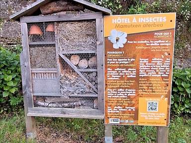 | Auf dem Bleidenberg am Mosel-Camino hoch über Alken steht dieses große Insektenhotel. Auch Pilgern wird dort ein schöner Rastplatz angeboten. | Aus einer Bohrung im Holz schaut ein Männchen der gehörnten Mauerbiene ins Freie. | Eine Pilgerin aus Düsseldorf ließ sich vom Engagement für den Artenschutz anstecken. Sie hat ad hoc beschlossen, sich mit ihen Kindern und Enkeln dafür einzusetzen und aktiv zu werden. | ||