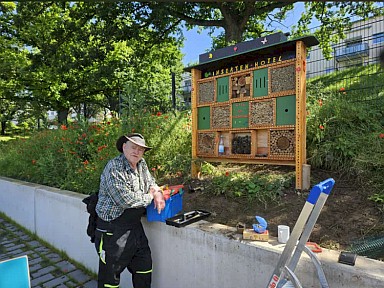 | Die Kita St. Hildegard auf der Horchheimer Höhe in Koblenz freut sich über das riesige Insektenhotel, das von Roberto Hastenteufel gebaut wurde und gepflegt wird.. | Aktiv in den Dienst des Naturschutzes stellt sich auch Birgit Ailbout aus Briedel an der Mosel. | In Briedel steht demnächst dieses große Insektenhotel. | ||