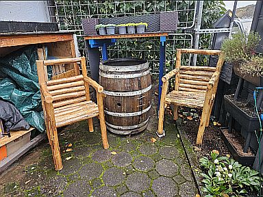 | Es geht auch einmal anders: zwei Gartenstühle Marke Eigenbau für die Gäste der Ferienwohnung. | Aktuell gibt es bei Lidl Futterkästen für Eichhönchen, und das für kleines Geld. Noch mit Bootslack streichen und schon ist die Box wetterfest. | Filigrane Arbeit steckt hinter den vielen Bohrungen dieser Ständer für zwei große Insektenhotels. Das kann Hans Ries besonders gut! | ||