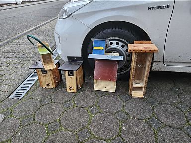 | Diese Kästen sind für Wander- und Turmfalken gedacht. Hat man einen solchen in der Nachbarschaft, verringert sich vielleicht auch die Taubenplage. | Glasflaschen sammeln für Vogelfuttersilos - das ist eine Idee. Diese 35 Flaschen mit Holzbausätzen können gerne eine Kita oder Schule abgegeben werden. | Eine kleine Auswahl von kleinen Kästen für den großen Artenschutz. | ||
