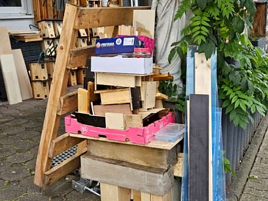 | Und wieder warten Material und ein Rahmen für ein neues Insektenhotel auf neue Besotzer. |
