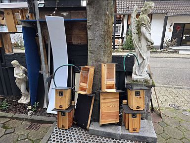 Jürgen Weiß hat heute eine Kofferraumladung mit Vogelnistkösten abgeholt. Als Wegepate auf dem Eifel-Camino wird er dort sicherlich ein paar gute Plätzchen ausfindig gemacht haben. |
